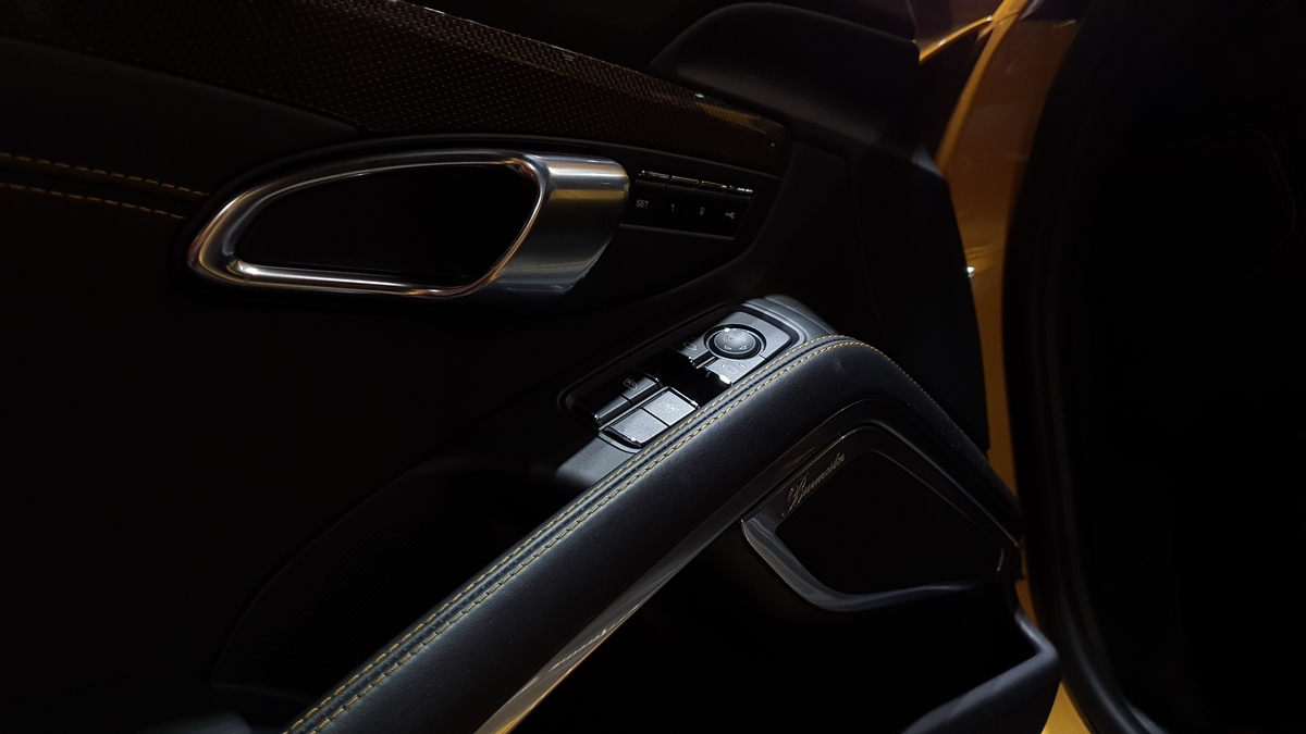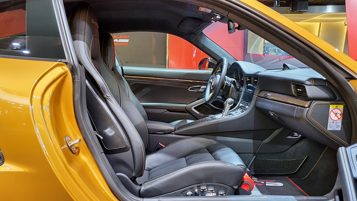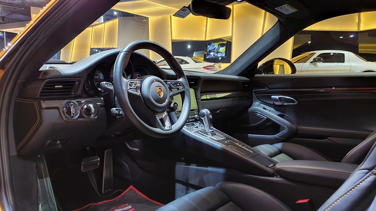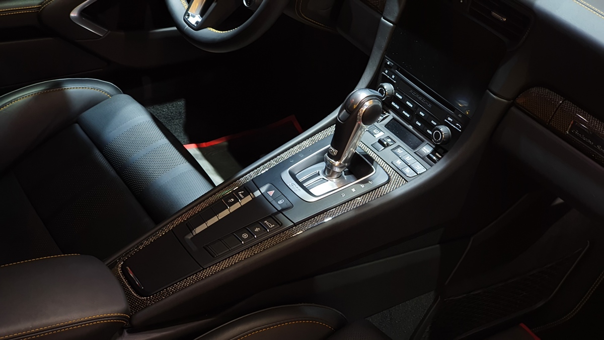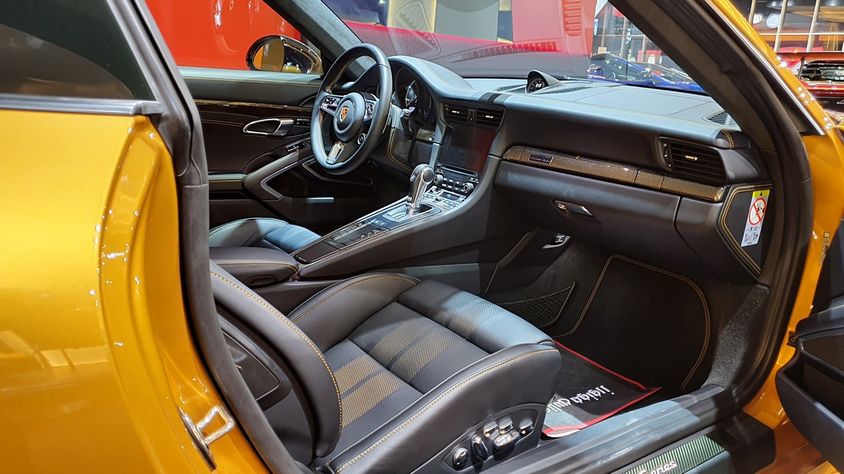 Inside, the cockpit is designed with deviation in mind. Two stripes of Golden Yellow run the length of the cabin, matching the headrest and headliner design as well. The carbon fiber interior kit incorporates thin copper thread, providing a unique application not seen on any other Porsche.