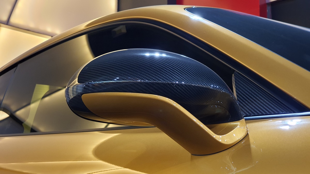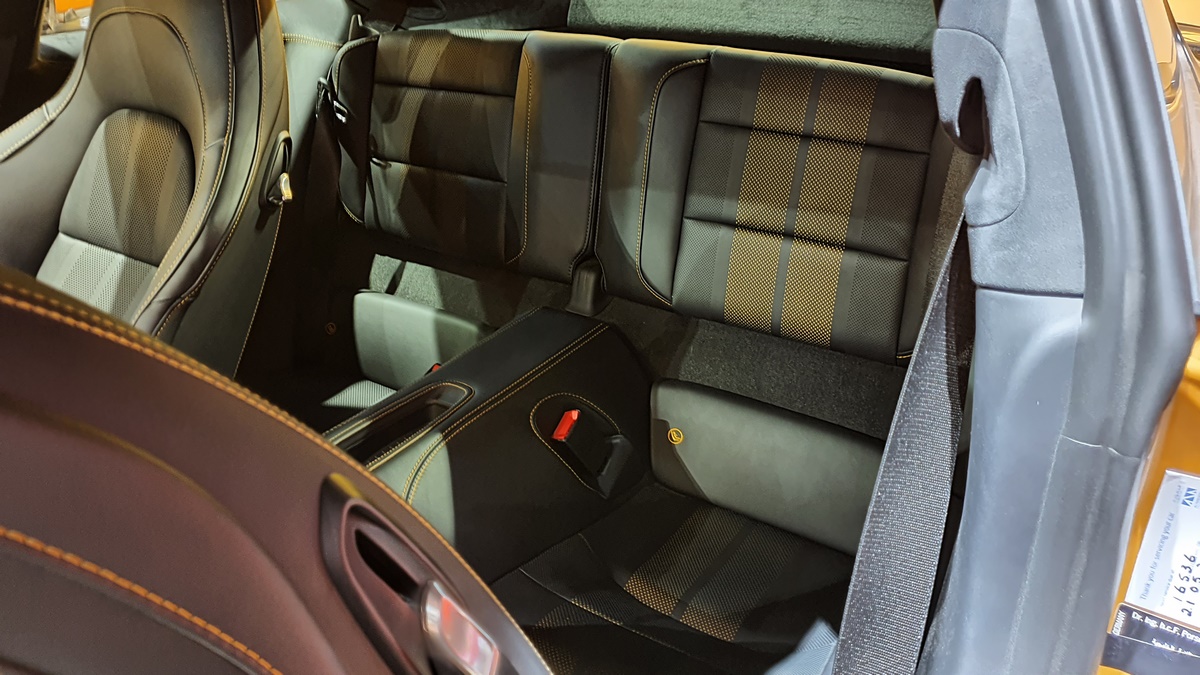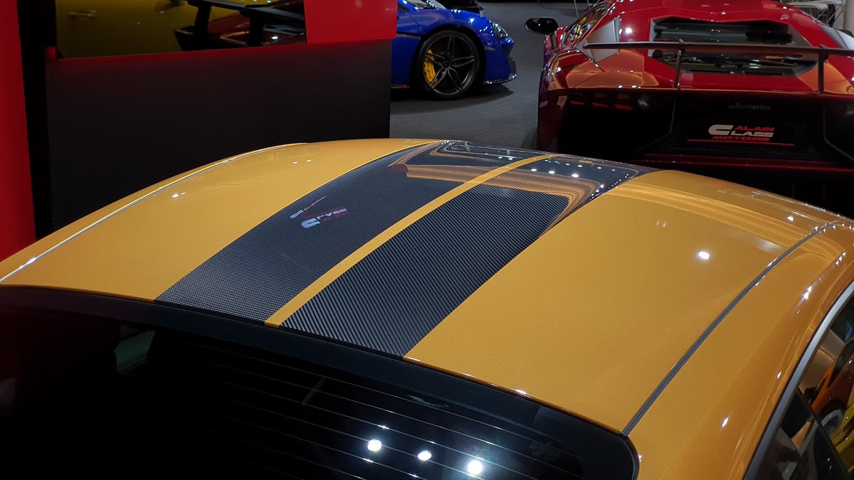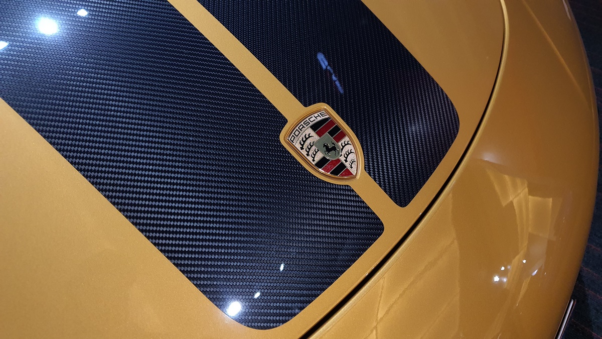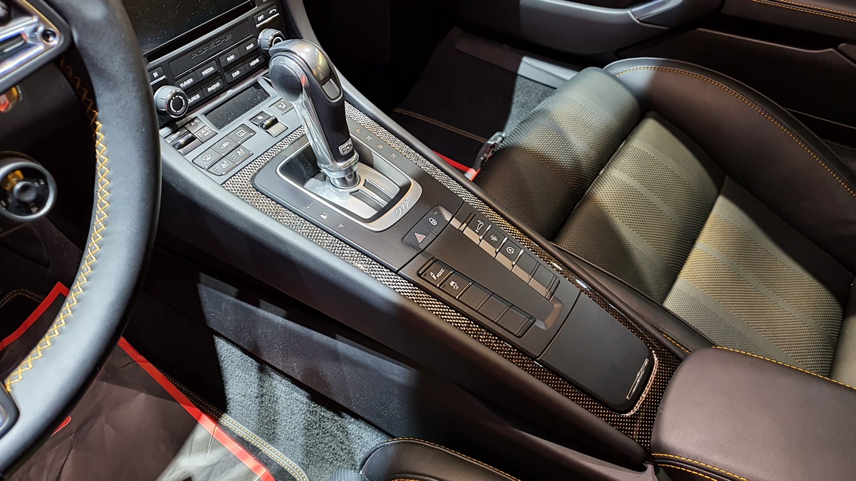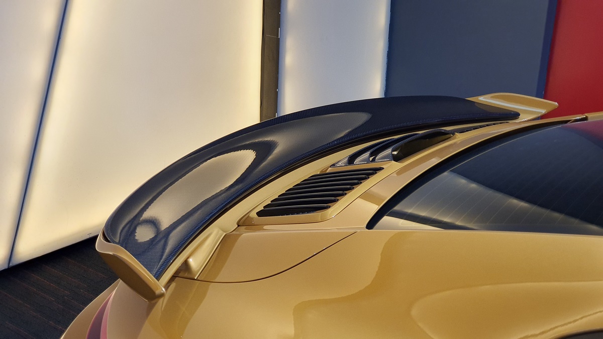 Inside, the cockpit is designed with deviation in mind. Two stripes of Golden Yellow run the length of the cabin, matching the headrest and headliner design as well. The carbon fiber interior kit incorporates thin copper thread, providing a unique application not seen on any other Porsche.