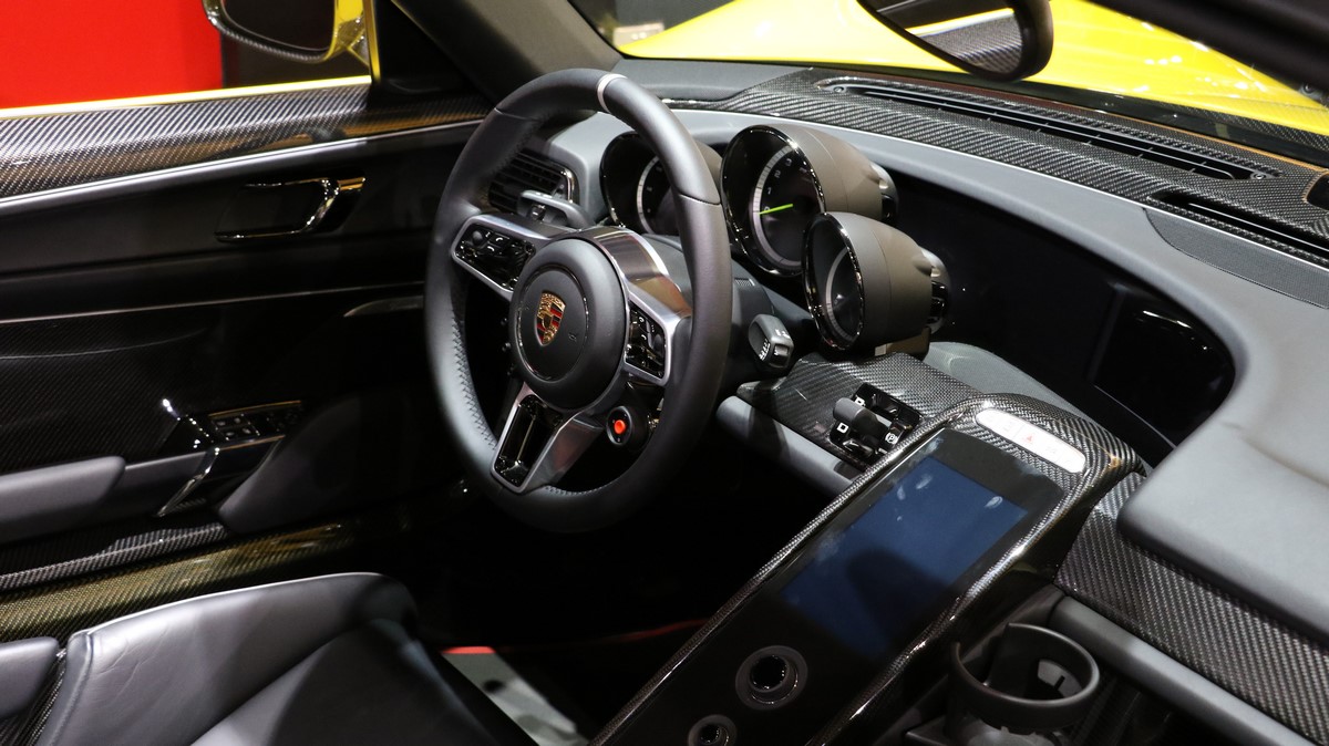 As you'd expect in Porsche's flagship sports car, the cockpit is designed to be very driver-oriented. Three analog gauges, including a large center-mounted tachometer, display important info with a quick glance. The steering-wheel-mounted drive mode switch and other driving-related controls are placed within easy reach. Carbon-fiber seats feature significant side bolsters for enhanced support in aggressive driving, and only differ from the optional racing seats in the firmness of the side bolster padding. In other words, this is a car that puts the driver first.
